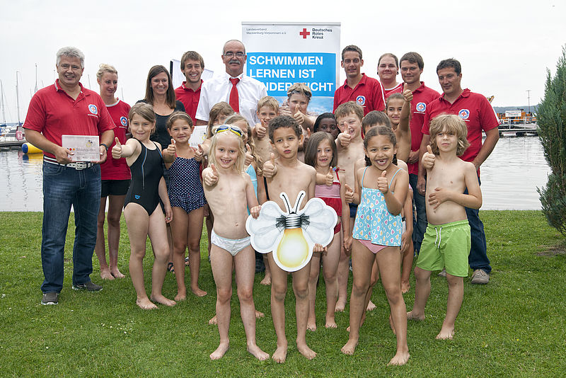 Über 70 DRK-Kitas in Mecklenburg Vorpommern machen mit bei „Rette sich wer's kann – Schwimmen lernen im Kindergarten“. Das Programm richtet sich an alle Kita-Kids im Bundesland. Die DRK-Wasserwacht besucht dazu ehrenamtlich Kitas und erklärt, wo das Baden gefährlich ist. Gemeinsam geht es in die Schwimmhalle, bis jedes Kind das „Seepferdchen“ absolviert hat. Außerdem bildet die DRK-Wasserwacht die Erzieherinnen und Erzieher zu Schwimmlehrerinnen und Schwimmlehrer aus, damit sie selber „Seepferdchen“-Kurse geben können. Das Programm erfordert keine festangestellten Mitarbeiterinnen und Mitarbeiter. Der Unterricht (Theorie und Praxis) für die Kinder wird ehrenamtlich gestemmt. Die Ausbildung der Erzieherinnen und Erzieher zu Schwimmlehrerinnen und -lehrer wird per Honorarvertrag gedeckt. Das Projekt ist intrinsisch angelegt, sodass es – nach unserem Anschub pro Kita – dort nachhaltig, kostengünstig und selbstständig fortgeführt wird.