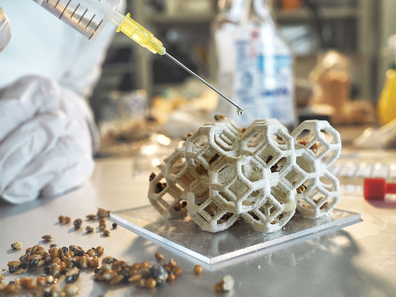 Das Projekt „plant b - aus der Natur - zurück in die Natur“ befasst sich mit alternativen Fertigungsmethoden in der Gestaltung. Da in der heutigen Zeit das verantwortungsvolle Verwenden von Ressourcen (Circularity) gerade im Materialdesign ein wichtiges Thema ist, wurden im Rahmen des Projektes zukunftsträchtige und nachhaltige Alternativen für die Herstellung von digital gestalteten Strukturen entwickelt. Hierfür wurde eine Methode konzipiert, um eine komplexe Raumstruktur aus Zellulose im 3D-Drucker zu fertigen und mit einem wachsenden Organismus (Weizengras und Myzel) und verschiedenen Wachsen (Stearin und Bienenwachs) auszuhärten. Das so entstandene Komposit ist biologisch abbaubar und kann dem Produktionsprozess wieder zugeführt werden.