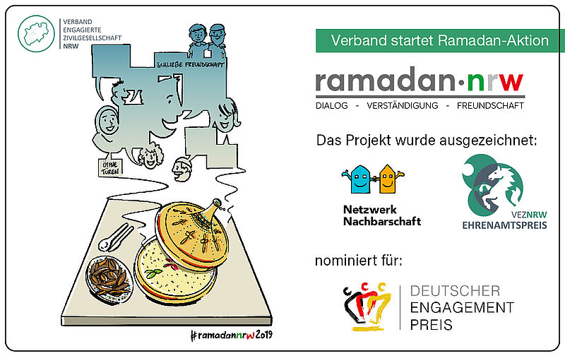Die Initiative ramadan-nrw mit seinem 4-köpfigen ehrenamtlichen Organisationsteam und weiteren 60 freiwilligen Kooperationspartnern in ganz NRW vereint interessierte Bürgerinnen und Bürger mit Musliminnen und Muslimen während des Fastenmonats Ramadan. Das ganze Projekt ist auf ehrenamtliches Engagement ausgerichtet. Dem Organisationsteam lag die Idee zugrunde ein Projekt zum Abbau von Vorurteilen gerade in Zeiten von vermehrter Ausgrenzung und Abschottung zu initiieren. Durch einen Besuch in einer gastfreundlichen und offenen muslimischen Familie bekommen Interessierte die Möglichkeit, einen Einblick in ein muslimisches Familienleben zu gewinnen und miteinander ins Gespräch zu kommen. Das Organisationsteam, die Kooperationspartner als lokale Schnittstelle zwischen Gastgeber und Gastfamilie als auch die Gastfamilie selbst sind allesamt ehrenamtlich am Projekt beteiligt. Für die Gäste bleibt die Teilnahme kostenlos.