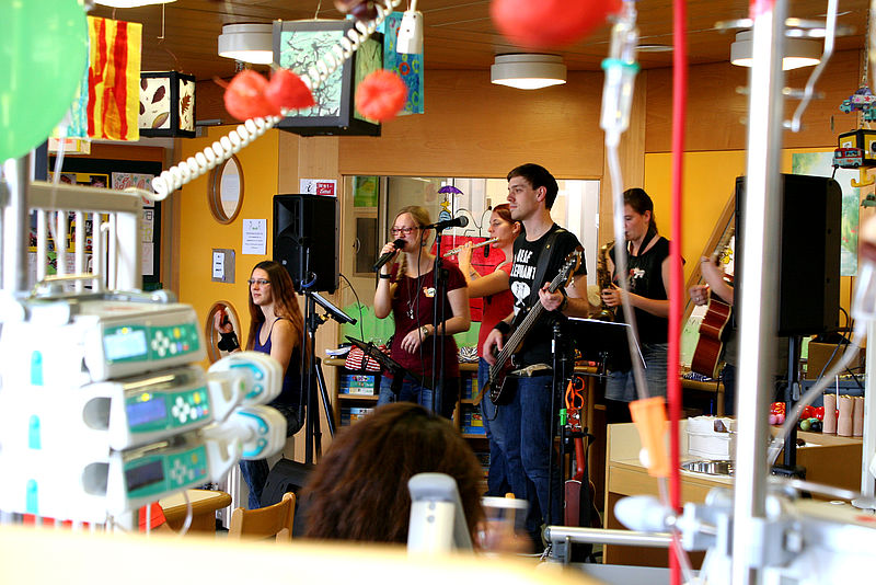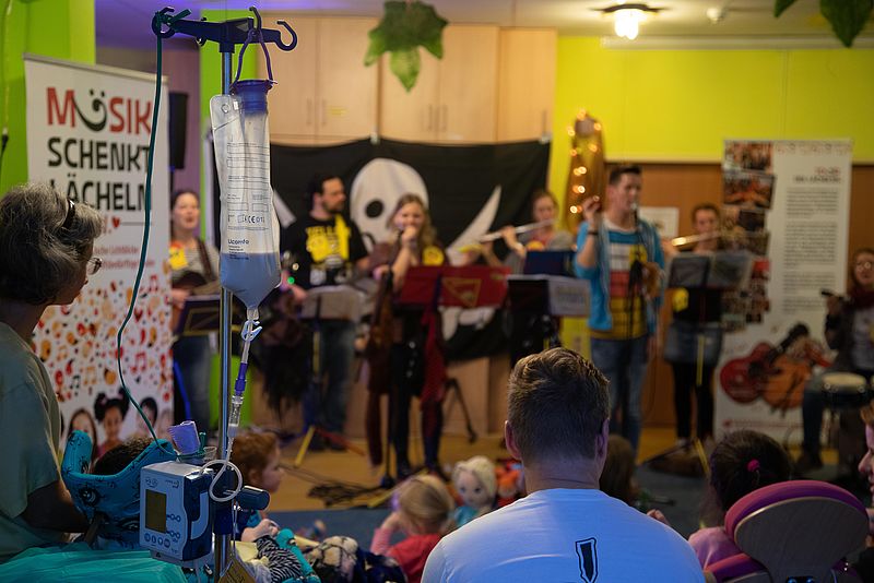 Musik kann bei Menschen einen Heilungsprozess positiv beeinflussen, eine aktuelle Lebensherausforderung in den Hintergrund rücken lassen und verschiedenste Emotionen auslösen. Daher musizieren die Mitglieder von Musik schenkt Lächeln e. V. ehrenamtlich für und mit Kindern in prekären Lebenslagen und/oder mit (schweren) Krankheitsbildern, um diesen ein unvergessliches Erlebnis mit viel Spaß und Freude zu schenken. Im Rahmen einer mehrwöchigen Tour des Lächelns werden Einrichtungen (u.a. Kinderkliniken, -rehazentren, -dörfer, -hospize sowie Kindergärten und Schulen für mehrfach behinderte Kinder) besucht. So können jährlich knapp 3.000 Kinder in über 60 Einrichtungen erreicht werden. Innerhalb von 60 bis 90 Minuten begeben sich die Kinder mit den Akteuren und Akteurinnen auf ein musikalisches Abenteuer. Darin • treffen sie unter anderem auf Pippi Langstrumpf und auf die Eiskönigen Elsa, • bilden alle(je nach körperlicher Einschränkung) gemeinsam einen Zug, • bewegen sich alle wie Flugzeuge oder fahren mit dem Bob, • trommeln und shakern gemeinsam mit Percussions bei Piraten sowie bei Affen. Neben der Interaktivität, bei denen die Kinder mit Tanz, Bewegungen, Percussions und Gesang – je nach deren Fähigkeiten – auch selbst mitmachen können, sind verschiedene Überraschungen vorbereitet, unter anderem mit Verkleidungen, Accessoires, Gegenstände. Je nach Ressourcen der Kinder wird das Programm flexibel angepasst. Folgend ein kurzes Video der letzten Tour: https://youtu.be/R4y1vio5Ozw