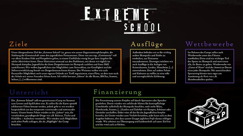 Das Projekt BS4P engagiert sich zum einen für einen neuen, modernen Skatepark in Pirmasens, damit Kinder und Jugendliche in Pirmasens ihrem Hobby im Skatepark nachgehen können. Dabei versuchen die Mitglieder des Projektes den Kindern einen Raum zu geben, in dem sie sorgenfrei einem Hobby nachgehen können, sodass die Kinder in ihrem Alltag Gemeinschaftssport betreiben können. Dabei ist es sehr wichtig, dass jeder an diesem Projekt teilnehmen kann. Deshalb werden den Kindern Geräte zur Verfügung gestellt, sodass jeder im Skatepark einer Aktivität nachkommen kann, egal, ob er oder sie die finanziellen Möglichkeiten hat oder nicht. Um dies zu verwirklichen, trifft sich der engere Kreis der Gruppe mehrmals in der Woche, um zum einen die Planungen für Workshops, den neuen Park und Projekte voranzutreiben, aber auch, um im Park aufzuräumen und Kindern das Skaten beizubringen, solange die Corona-Maßnahmen dies erlauben.