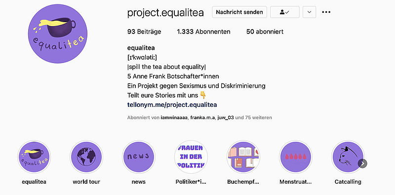 Ein Projekt von Jugendlichen an Jugendliche! Das ist die Mission des Projekts „project.equalitea“, das sich gegen Sexismus richtet und für Gleichberechtigung einsetzt. Wie erreicht man fast alle Jugendliche heutzutage am besten? Natürlich auf den sozialen Medien! Deshalb wurde im Januar 2020 ein Instagram Account eröffnet, auf dem regelmäßig Beiträge für Gleichberechtigung und Inklusion veröffentlicht werden. Mit kurzen Filmen, Infos zu aktuellen Bewegungen, Exkursen ins Recht und vor allem individuellen Geschichten werden Vorurteile und diskriminierende Strukturen in der Gesellschaft aufgedeckt. Auch lokale Organisationen, die sich für eine vielfältige Gesellschaft engagieren, werden vorgestellt, um den Followerinnen und Followern direkte Anknüpfungspunkte für ein diverses Engagement zu liefern. Gleichzeitig wird immer ein Blick über den Tellerrand hinaus geboten, indem Erfahrungen aus anderen Ländern geteilt werden. Project.equalitea ist mehr als ein Info-Account zu Gleichberechtigung und Sexismus, sondern eine lebendige Plattform des Austauschs, die einerseits informiert, andererseits neue Perspektiven vermittelt und zivilgesellschaftliche Partizipation fördert. Es sind bereits mehr als 1300 Abonnentinnen und Abonnenten, die dem Account folgen.