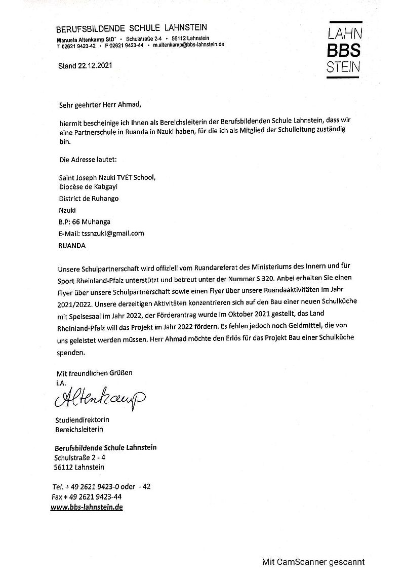 Die Ziele des Projekts sind die Nachhaltigkeit durch Recycling von Plastik und die Unterstützung von Bildung in Ruanda. Die Schüler:innenvertretung strebt eine nachhaltige, inklusive und gerechte Zukunft an. Jeder Mensch hat ein Recht auf Bildung. Und dieses Recht soll mit der nachhaltigen Methode unterstützt werden. Bereits an der eigenen Schule, der BBS-Lahnstein, wurde ein Konzept zum Pfandmanagement entwickelt und umgesetzt, da sehr viel Pfand in den Abfall gelangt und die Umwelt belastet. Nun möchte die Schülervertretung das Konzept auch in der regionalen Kommune weiter ausbreiten und bundesweit teilen. Dazu wurde ein klares System zur Pfandtrennung von dem normalen Abfall eingerichtet, indem neben den großen Abfalleimern im Schulgebäude auch große Eimer für das Pfand aufgestellt wurden. Damit werden alle Pfandflaschen von dem restlichen Müll getrennt und der erzielte Erlös, jährlich ca. 400€, wird dann an die Partnerschule in Ruanda gespendet. Gleichzeitig wird auch die Umwelt entlastet. Rund 1.400 Schülerinnen und Schüler tragen zu dem Projekt bei, um beispielsweise den Bau einer neuen Schule zu beschleunigen. Jetzt sollen neben den zentralen Abfalleimern in der Stadt, in Absprache mit der Stadtverwaltung, auch solche Pfandflaschensammler hingestellt werden. Ein Konzept, welches viele weitere Jahre genutzt werden kann, dass sich längerfristig rentiert. Der erste Schritt in Richtung sozialer, wirtschaftlicher und ökologischer Nachhaltigkeit.