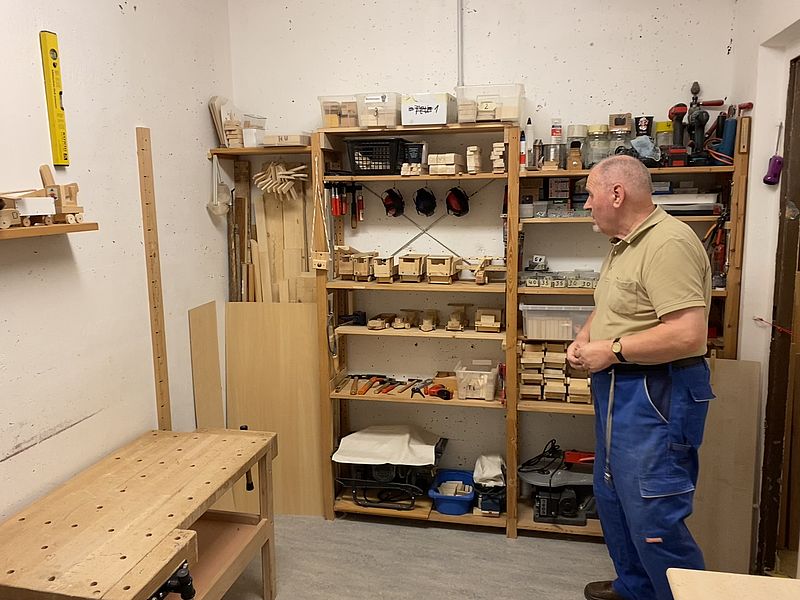 Herr Kohlhoff (85 Jahre alt) engagiert sich seit vielen Jahren als "Opa Achim" ehrenamtlich in unserem Kindergarten "Sommersprosse". Unser Haus und die Werkstatt teilen wir uns mit einem zweiten Kindergarten, dem Kindergarten "Farbenklecks". 260 Kinder im Alter von 1 Jahr bis Schuleintritt leben, spielen und lernen hier gemeinsam. Täglich ist "Opa Achim" mit den Kindern in der hieransässigen Holzwerkstatt tätig. Diese hat er selbst eingerichtet und pflegt sie, hat eine gute Struktur in der Ablage der Materialien und Werkzeuge und hält Ordnung. Hier bringt er den Kindern die Be- und Verarbeitung von Holz näher. Dabei lernen sie den Werkstoff Holz mit seinen Eigenschaften sowie die entsprechenden Werkzeuge in ihrer Funktion und Handhabung kennen. So entstehen u.a. nach Wunsch der Kinder verschiedene Fahrzeuge, wie LKW, Eisenbahn, Kran, Flugzeuge, bis hin zu Windmühlen, Gitarren, Puppenwippen und Handys. Durch seinen erlernten Beruf des Küfers und seine handwerkliche Begabung verfügt er über enormes Fachwissen im Umgang mit dem Werkstoff Holz, welches er gern weitergibt. Durch seine herzliche und ausgeglichene Art ist er ein beliebter Ansprechpartner und Vertrauensperson der Kinder. Er ist für uns und die Kinder ein großer Schatz des Hauses. Jeden Samstag ist er zudem zusätzlich im Kindergarten und bereitet Holz auf und die Materialien für die Kinder vor, welche noch nicht von den Kindern durch Unterstützung selbstständig angefertigt werden können.